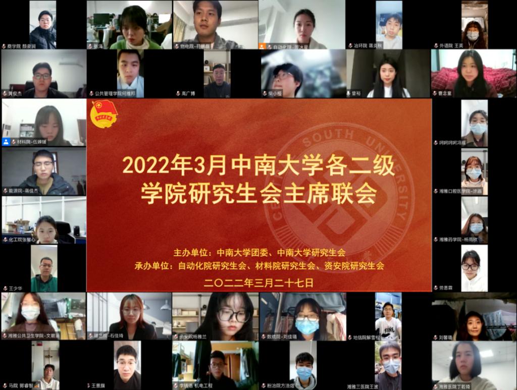 喜迎二十大、永远跟党走、奋进新征程,为加强二级公司研究生会思想政治建设,切实落实团委的指导精神,增强研究生会自我民主建设的力度,提高研究生会工作效率,2022年3月27日下午,球王会体育官网二级公司研究生会线上主席联会顺利举行。会议由共青团球王会体育官网委员会、球王会体育官网研究生会主办,自动化学院研究生会、材料科学与工程公司研究生会、球王会研究生会承办,球王会体育官网研究生会执行主席曾裕主持会议。