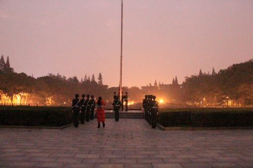 6:45,国旗护卫队的旗手伴着慷慨激昂的旋律,迈着整齐划一的步伐,从升旗台东侧缓缓走来。随着国歌声响起,鲜艳夺目的五星红旗冉冉升起,在场师生全体肃立,行注目礼,深怀着对祖国的无限热爱和崇高的敬意。