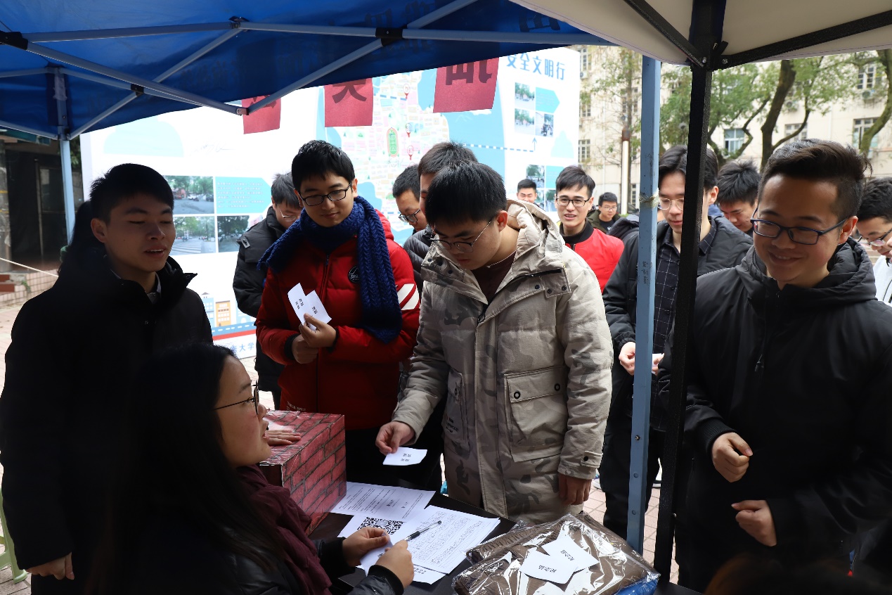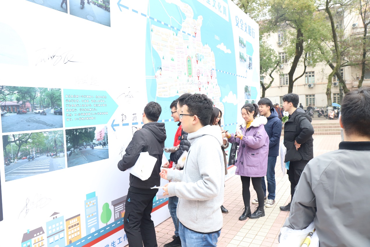 为丰富安全文化周活动内容,承办方结合线上交通主题教育内容,制作了交通安全主题展板,分别在南校区二食堂和校本部三五食堂两个校区人流量较多的地方展览。线下展示活动还设置了安全文化小游戏、知识问答、签名互动等趣味十足的环节,吸引了众多师生前来参与,进一步提升了活动影响力,普及了校园安全文化知识,服务了全校师生,共享校园平安。